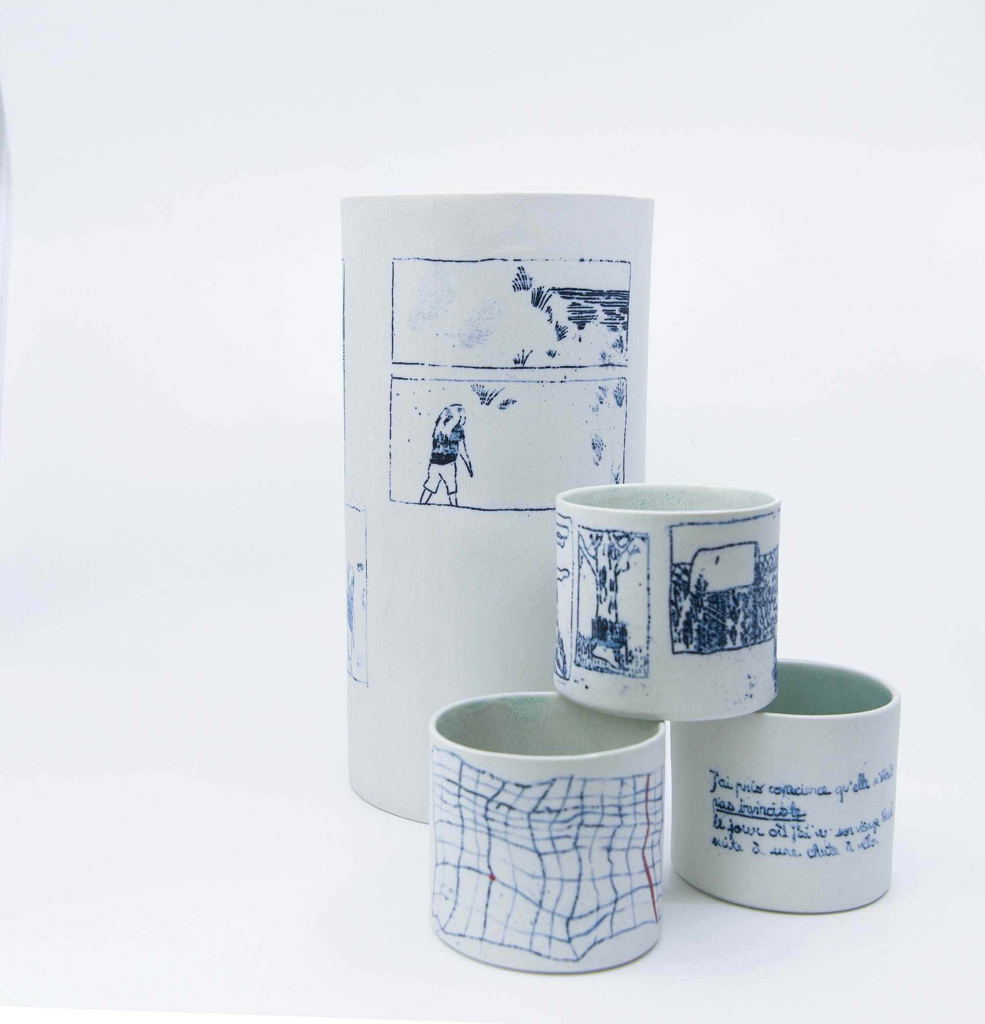 Une collection de cylindres uniques en porcelaine où l'illustration narre une histoire d'amour et de deuil.